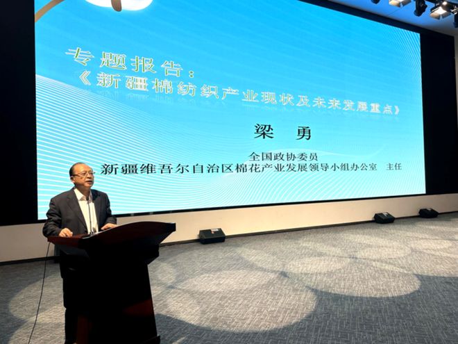 专题报告环节,全国政协委员、新疆维吾尔自治区棉花产业发展领导小组办公室主任梁勇介绍了2025年新疆棉纺织产业发展现状,并根据自治区正在编制的中长期发展规划,介绍了未来新疆纺织服装产业的发展重点。梁勇首先介绍了新疆棉花产量及纺织原料结构的变化情况;立足资源禀赋,未来新疆纺织服装产业发展重点将突出“高端化、智能化、绿色化”,并加快构建具有新疆特色和竞争优势的现代化纺织产业体系。