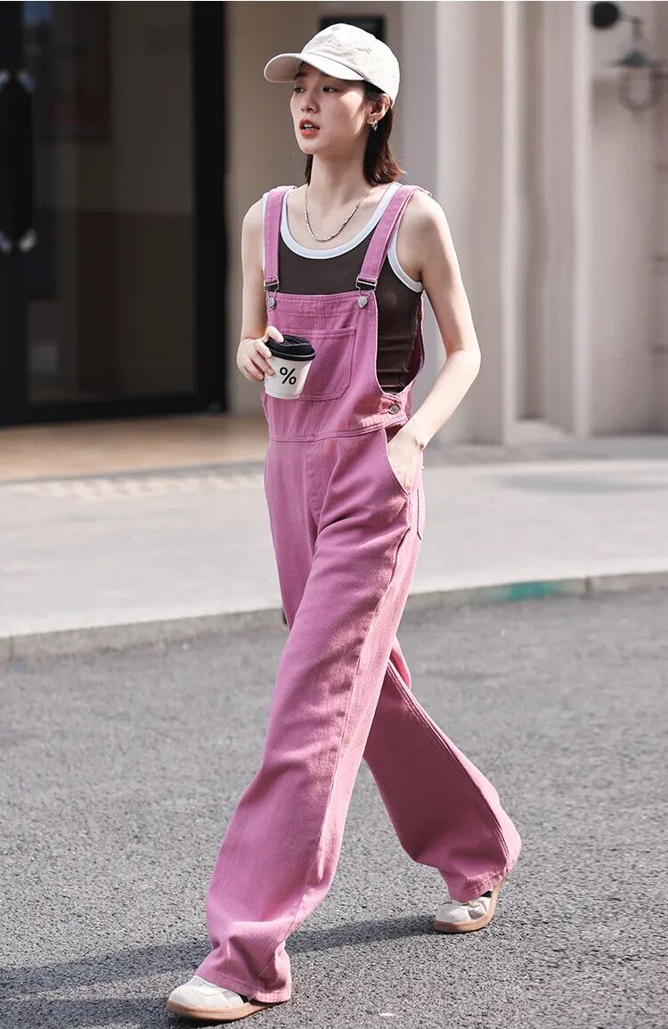 如果说甜美背带裤是青春的甜蜜回响,那么宽松工装裤则是都市女性追求自由与舒适的时尚宣言。彩色牛仔工装裤,以其独特的剪裁和实用性,成为了街头巷尾的潮流宠儿。无论是哪种色调都能完美融合工装元素的硬朗与牛仔面料的随性,展现出一种“可盐可甜”的多面魅力。搭配一双运动鞋,即刻化身都市中最亮丽的风景线,诠释着“时尚不设限”的生活态度。