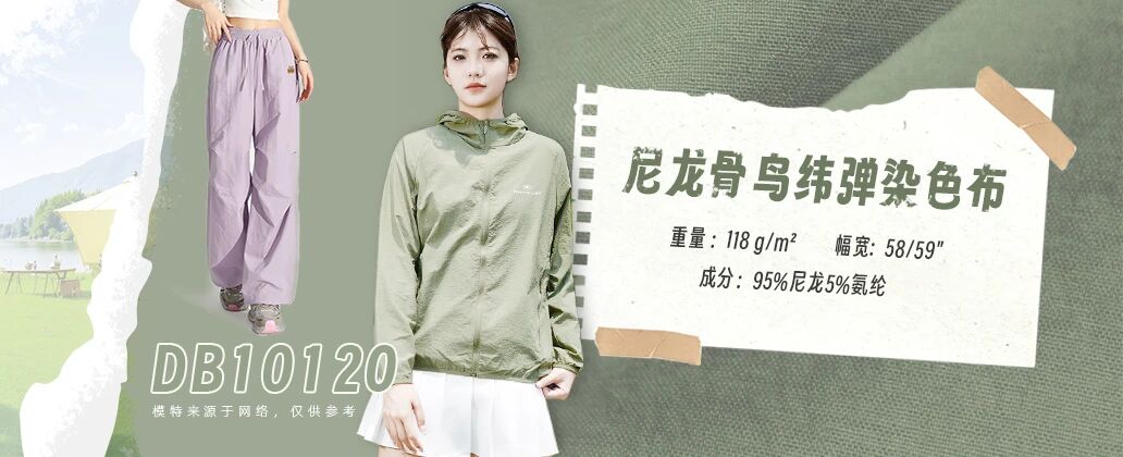 面料黑科技:DB10120的魔法 这些户外服饰的灵魂,正是 DB10120尼龙骨鸟纬弹(仿棉锦)面料,这可不是一块普通的布。它像一位“全能运动员”,把尼龙的轻盈挺括、柔软舒适、氨纶的出色弹性融为一体:118g/m²的轻盈身躯,比普通运动面料轻30%,却藏着95%尼龙+5%氨纶的黄金配比。尼龙纤维撑起骨架,氨纶丝赋予弹性,摸上去像第二层皮肤般柔软,却能扛住树枝刮蹭和背包摩擦。58/59"的黄金幅宽,剪裁更随心。面料垂坠感十足却不拖沓;仿棉锦的触感像触摸云朵,却比纯棉快干3倍。