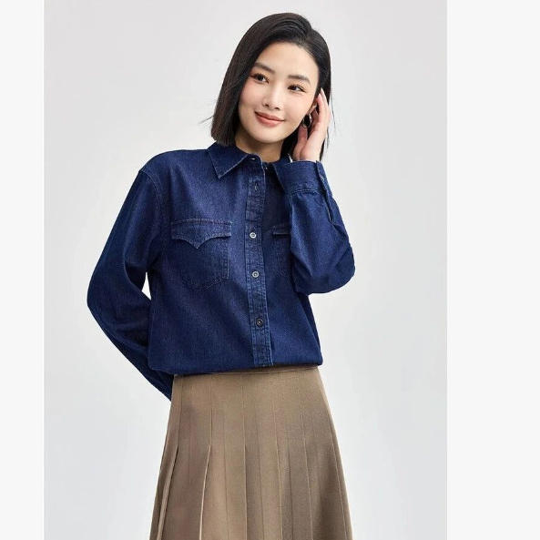 女款牛仔衬衫:纯棉气质,高级感满满 这款精致气质女士牛仔衬衫,以深蓝色的色调呈现,既百搭又具有一定的时尚感。款式上,它采用了经典的牛仔衬衫设计,翻领设计增添了几分干练气质,适合日常穿着或休闲场合搭配。前胸的两个口袋,在视觉上起到了装饰作用,让整件衬衫看起来更加精致。面料方面,这款衬衫同样采用了全棉斜纹牛仔布UN89010,纯棉的材质既保证了穿着的舒适度,又赋予了衬衫良好的透气性和吸湿性。同时,牛仔布的质感让整件衬衫在柔美中又不失硬朗与帅气,展现出女性特有的多元魅力。