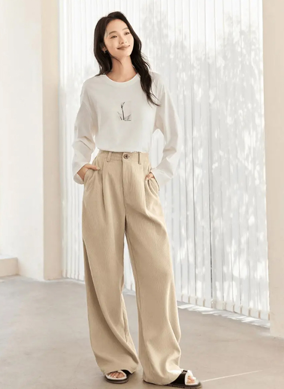 明星同款的高腰阔腿灯芯绒裤,简直是梨形身材救星。能藏住假胯宽,视觉增高 5cm 不是梦。搭配短款卫衣,气场直接拉满。