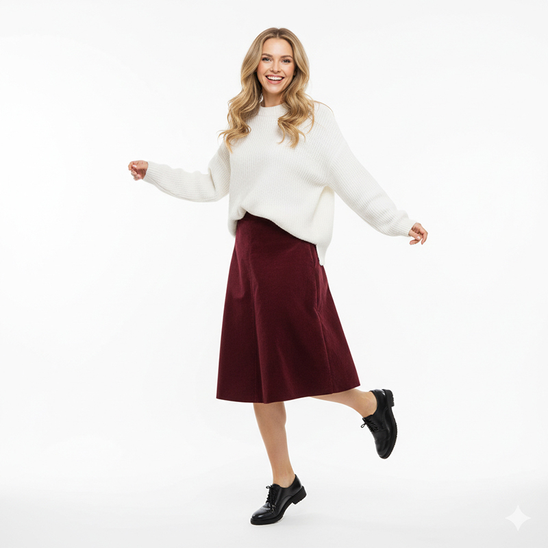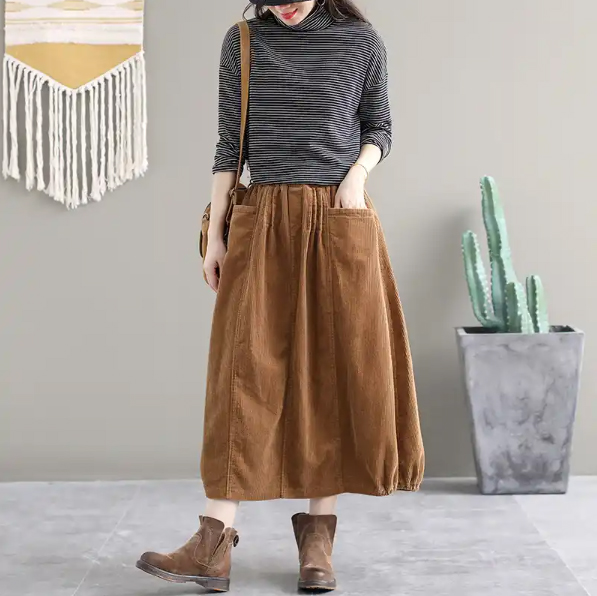A 字灯芯绒半身裙是通勤约会双料王。收腰显瘦,裙摆走路带风,搭配针织衫化身职场淑女,换双小皮鞋又能秒变甜妹。