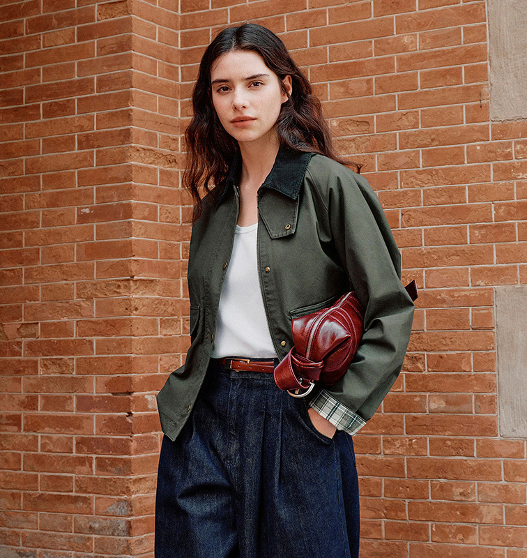 灯芯绒混搭棉布做短款外套,领口布料使用柔软绒面,衣身用加厚高密棉布,挺括有型,行走间层次感十足。