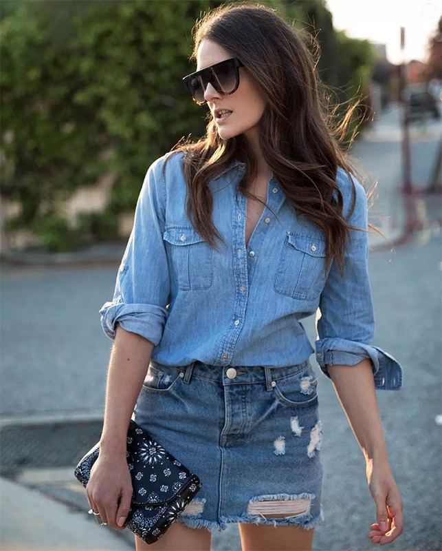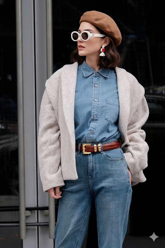 通勤场景讲究 “正式感平衡”。牛仔衬衫搭配烟管牛仔裤,外搭大地色系西装外套,用正式单品中和牛仔的休闲感。