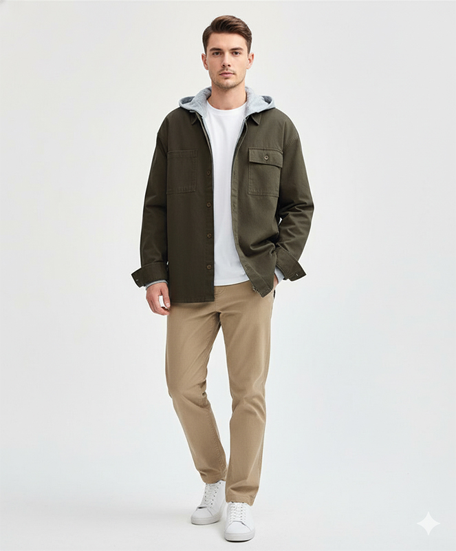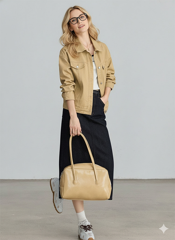 面料上,加厚棉布、帆布、牛仔布等硬挺材质不仅耐磨耐穿,还能自然撑起廓形,省去了熨烫打理的麻烦,随手一套就是利落造型。