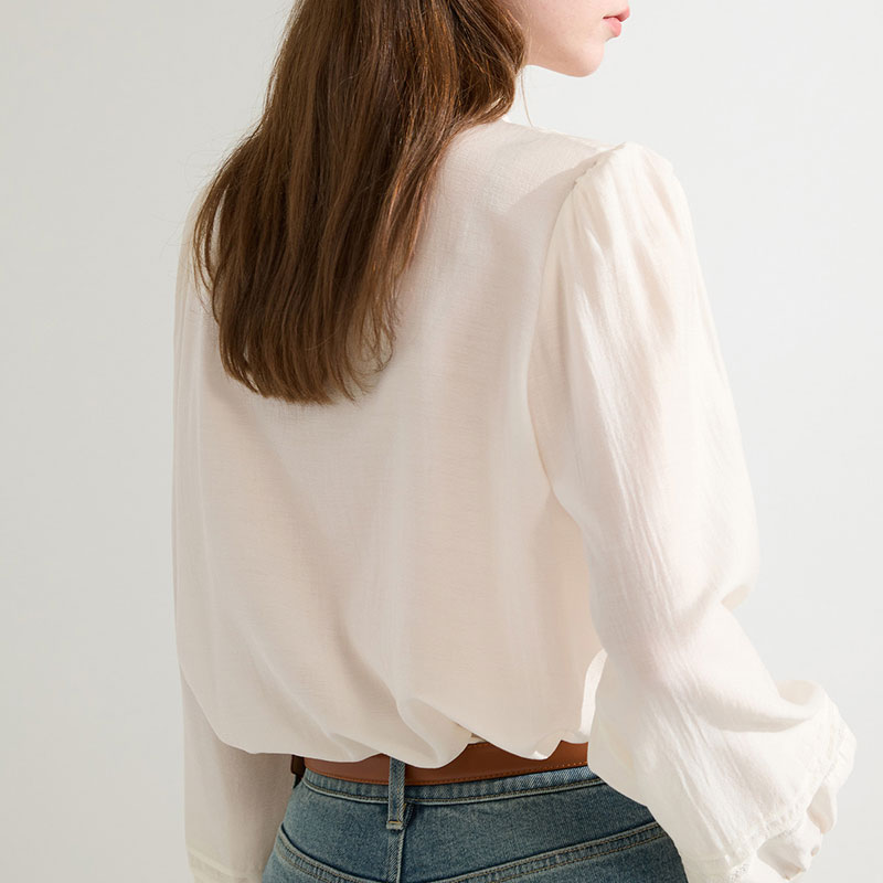 三彩木耳边V领长袖衬衫:自带氛围,轻柔似风,单穿内搭随你所愿