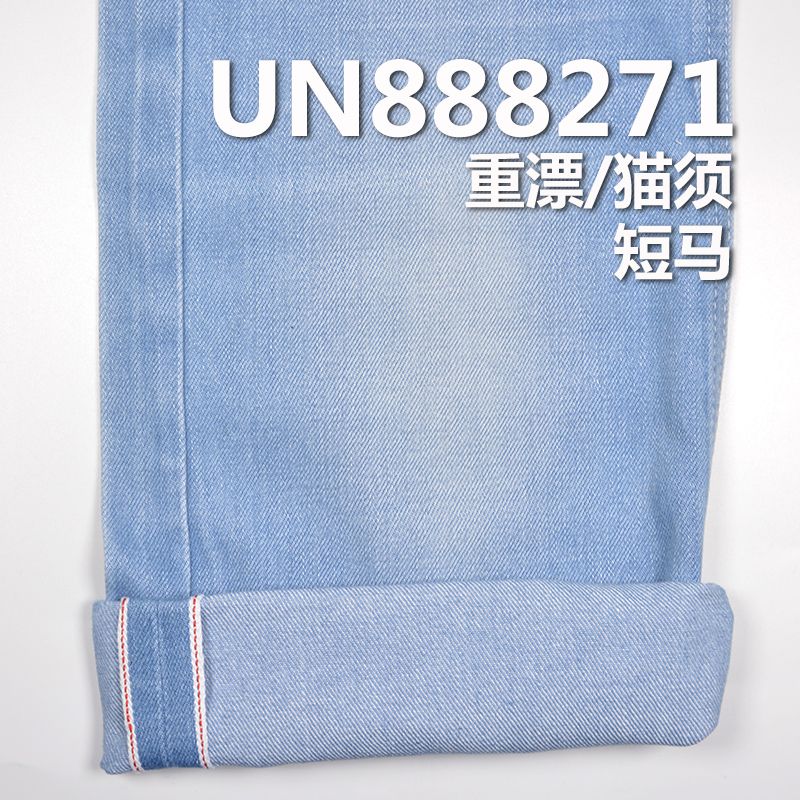 它是一款100%棉,重量为12安士(oz)、幅宽为32/33"的牛仔布料,主要工艺是“全棉+红边牛仔布”,货号为UN888271;