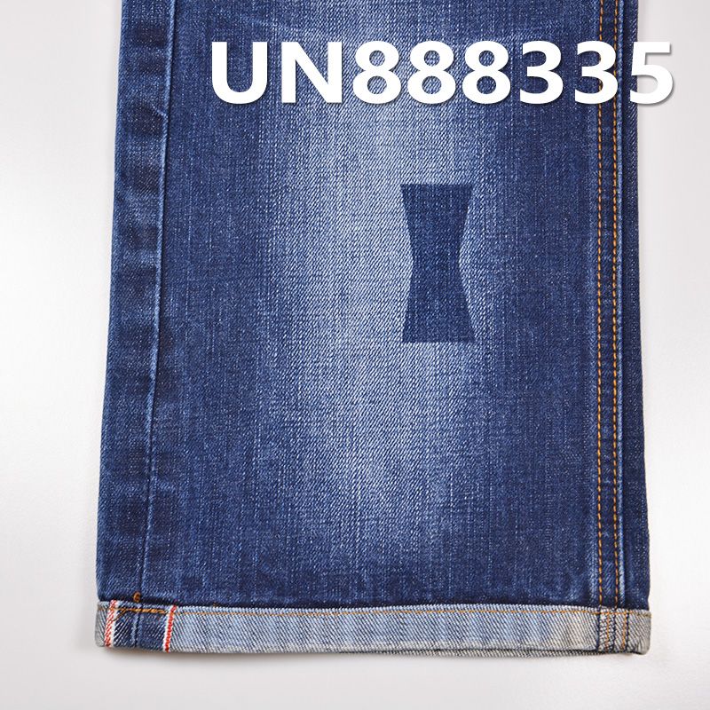 它是一款100%棉,重量为12.4安士(oz)、幅宽为31/32"的牛仔布料,主要工艺是“全棉+红边牛仔布”,货号为UN888335;