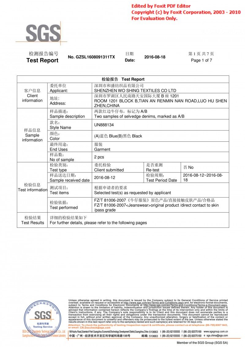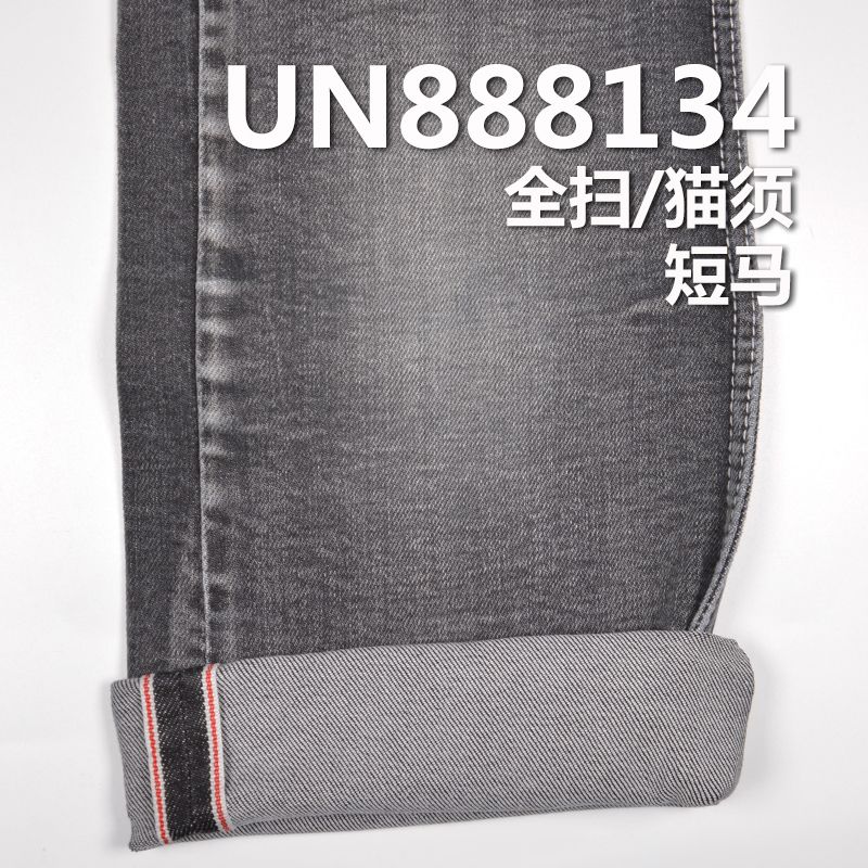 它是一款99%棉1%氨纶,重量为11.7oz、幅宽为57/58"的牛仔布料,主要工艺是“棉弹力+红边牛仔”,货号为UN888134;