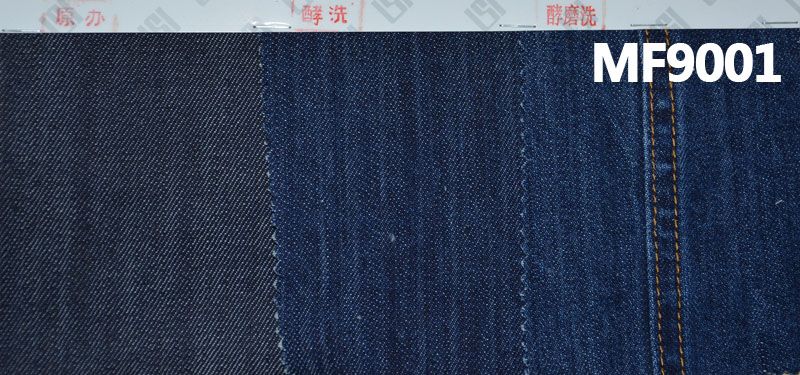 它是一款100%棉,重量为11安士(oz)、幅宽为 58/59"的牛仔布料,主要工艺是“四片右斜+全棉牛仔布”,货号为 MF9001;