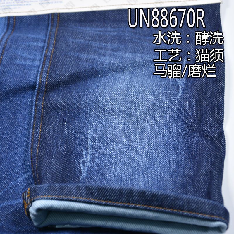 它是一款100%棉,重量为13.8安(oz)、幅宽为 58/59" 的秋冬款牛仔布料,主要工艺是“全棉+双层牛仔”,货号为 UN88670R;