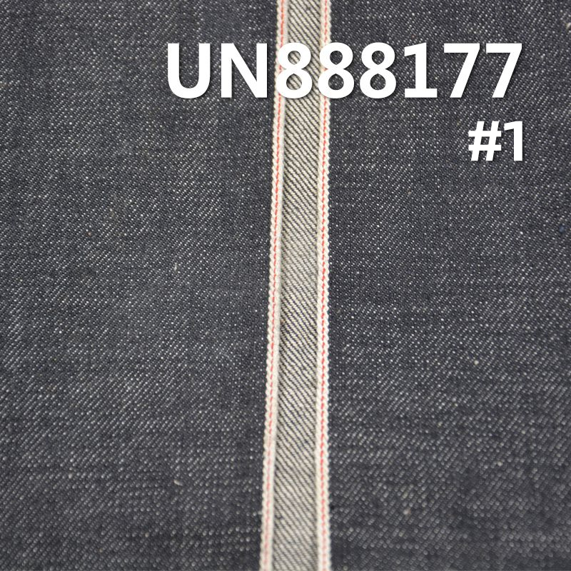 它是一款100%棉,重量为14.5安士(oz)、幅宽为 31/32" 的牛仔布料,主要工艺是“全棉竹节红边牛仔+四片右斜”,货号为 UN888177;