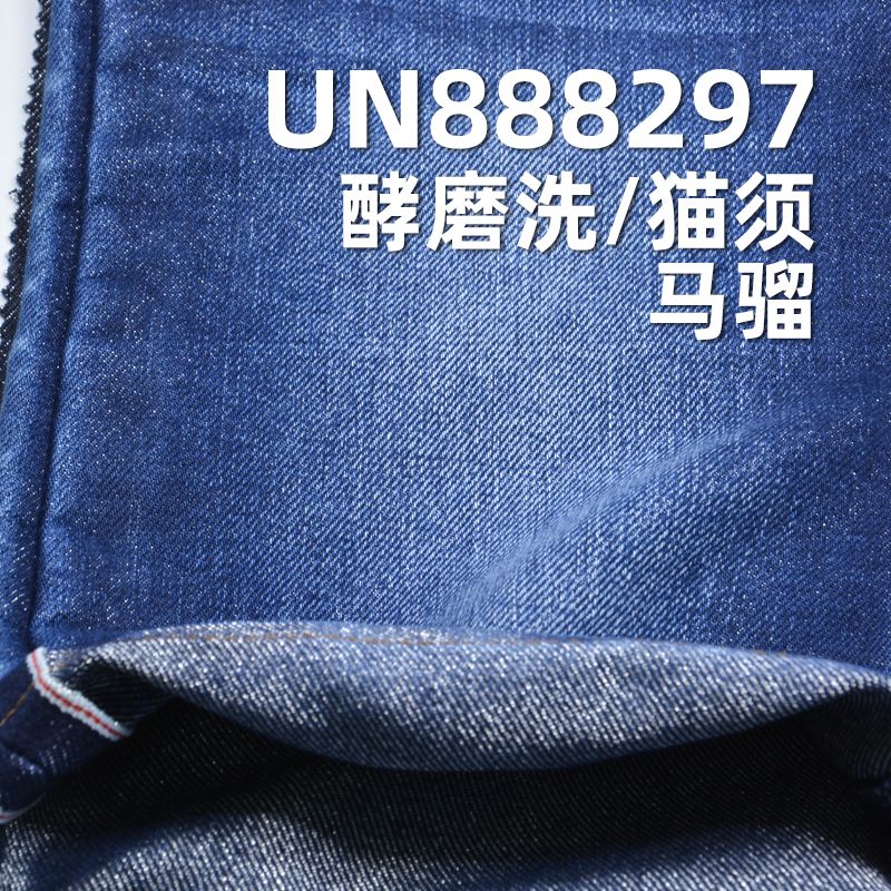 它是一款53.2%棉 36.5%涤纶 10.3%银丝,重量为 15安士(oz)、幅宽为 32/33" 的牛仔布料,主要工艺是“四片右斜+银丝红边牛仔”,货号为 UN888297;