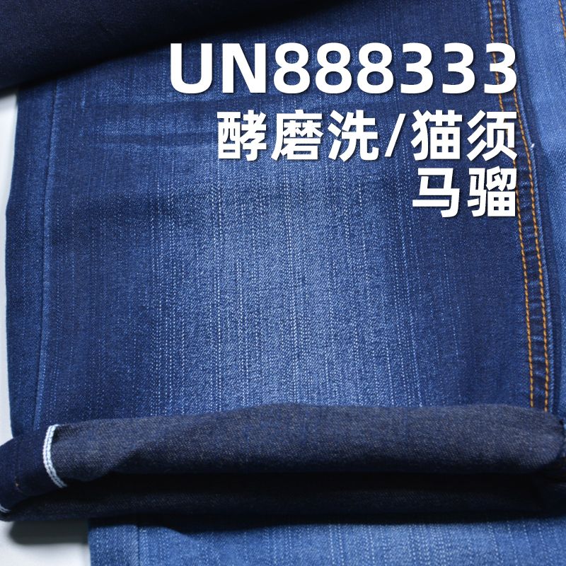 它是一款74%棉 26%人棉,重量为7.5安士(oz)、幅宽为31/32" 的牛仔布料,主要工艺是“人棉竹节+红边牛仔布”,货号为 UN888333;