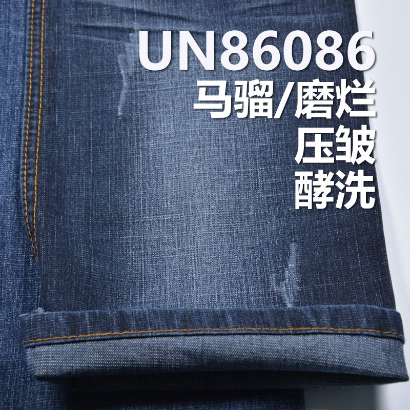 它是一款13%涤纶 87%棉,重量为 9.9安(oz)、幅宽为 48/49" 的牛仔布料,主要工艺是“竹节+斜纹牛仔”,货号为 UN86086;