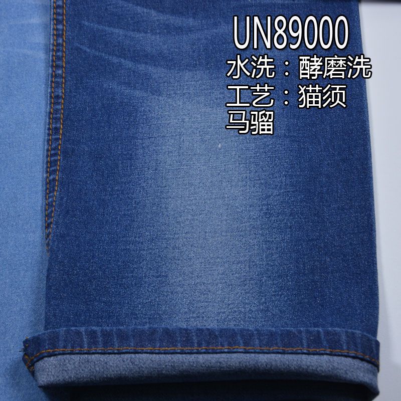 它是一款98%棉2%氨纶,重量为 8安士(oz)、幅宽为 49/50" 的牛仔布料,主要工艺是“左斜纹+弹力牛仔”,货号为 UN89000;