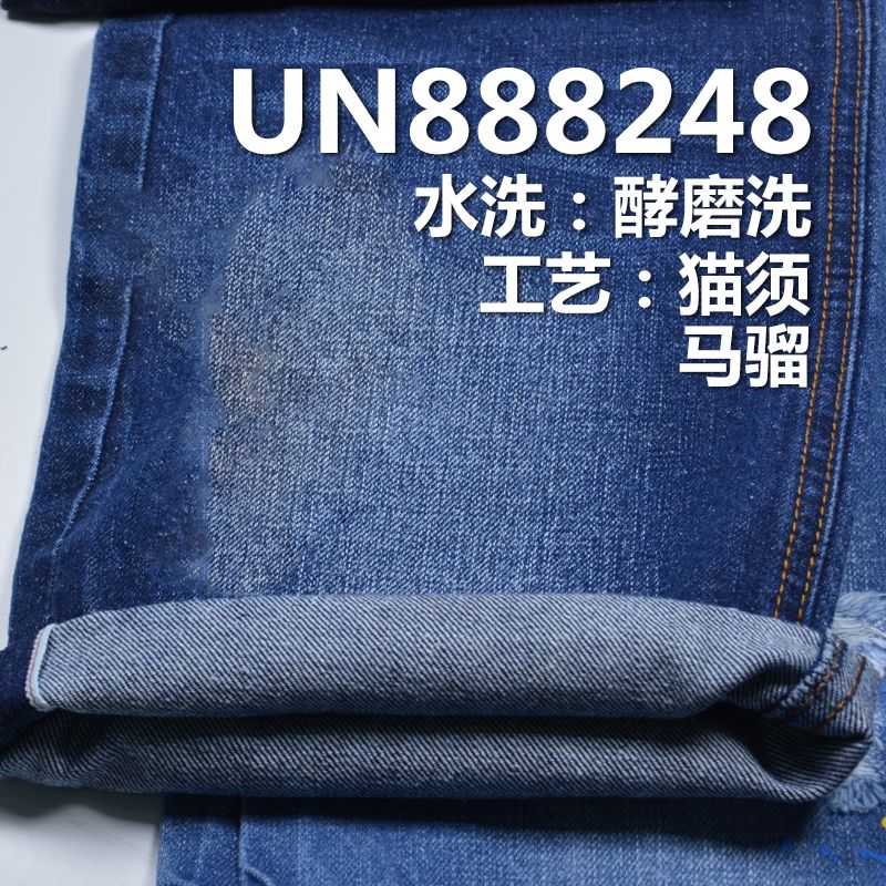 它是一款100%棉,重量为12安士(oz)、幅宽为 30/31"的牛仔布料,主要工艺是“全棉竹节+珍珠底”,货号为 UN888248;