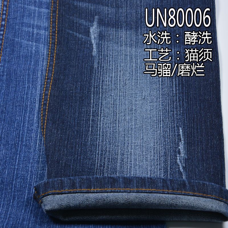 它是一款98%棉 2%氨纶,重量为 9.9安士(oz)、幅宽为 54/56" 的牛仔布料,主要工艺是“右斜纹+弹力牛仔”,货号为 UN80006;