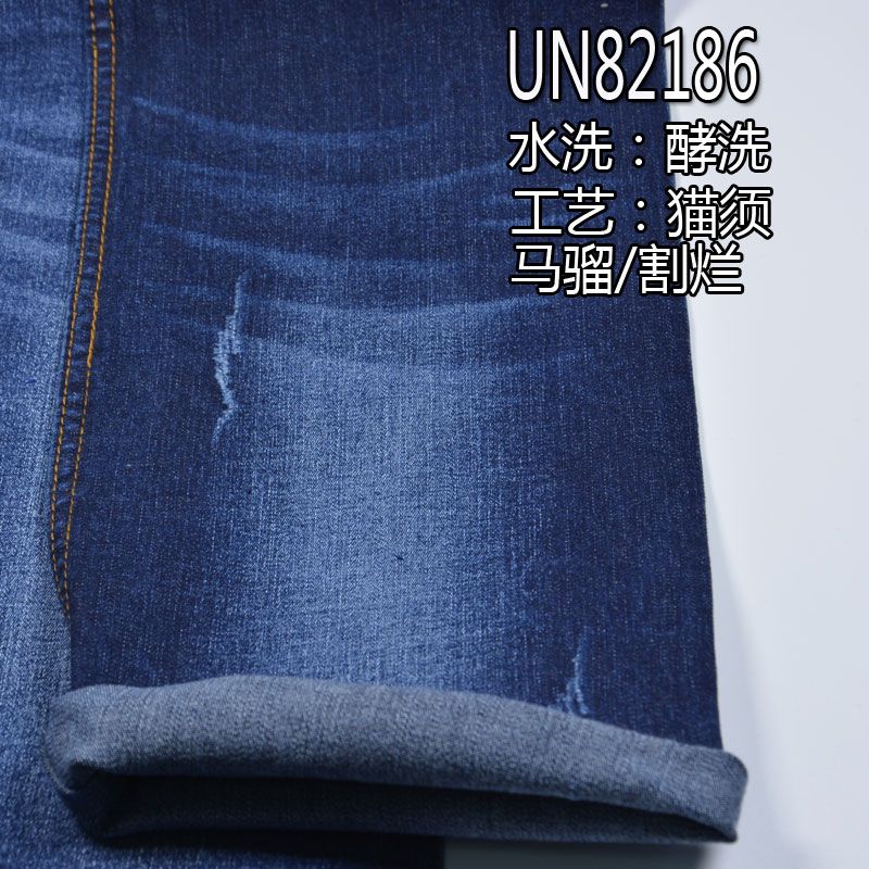 它是一款97.2%棉 2.8%氨纶,重量为 8.5安士(oz)、幅宽为 52/54" 的牛仔布料,主要工艺是“棉弹+竹节牛仔布”,货号为 UN82186;