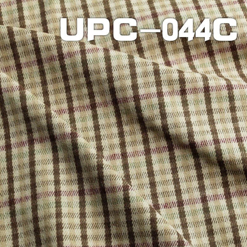 它是一款100%全棉,克重为270g/m²,幅宽为43/44"的色织面料,主要工艺是“平纹色织+磨毛”,货号为UPC-044C;