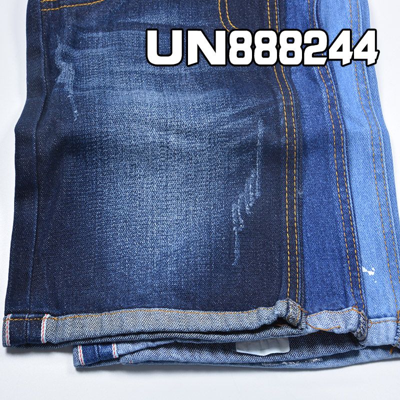它是一款100%全棉,克重为12安士(oz),幅宽为29/30"的梭织面料,主要工艺是“全棉+红边牛仔”,货号为UN888244;