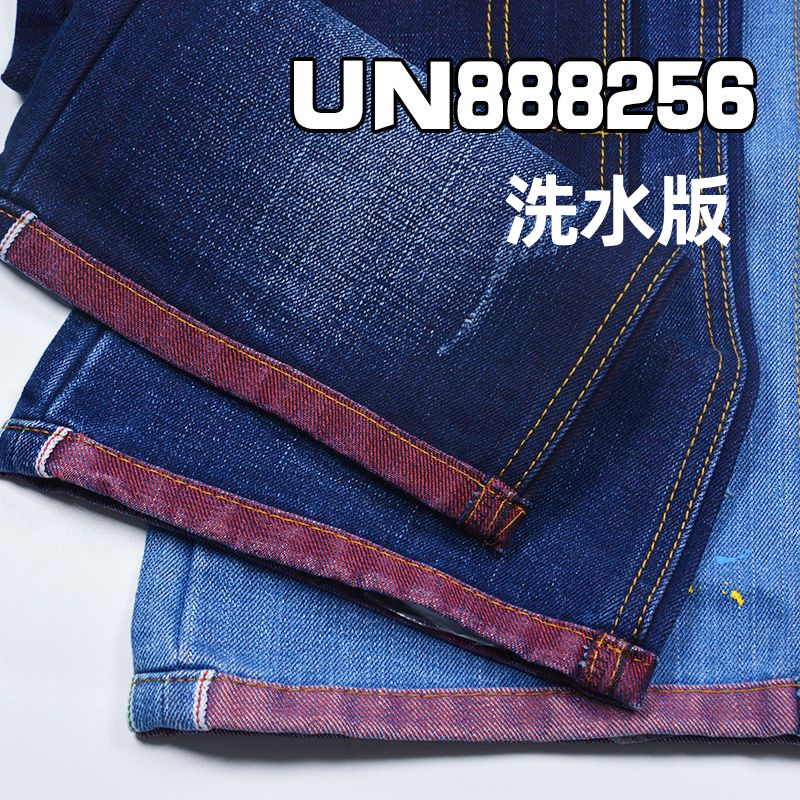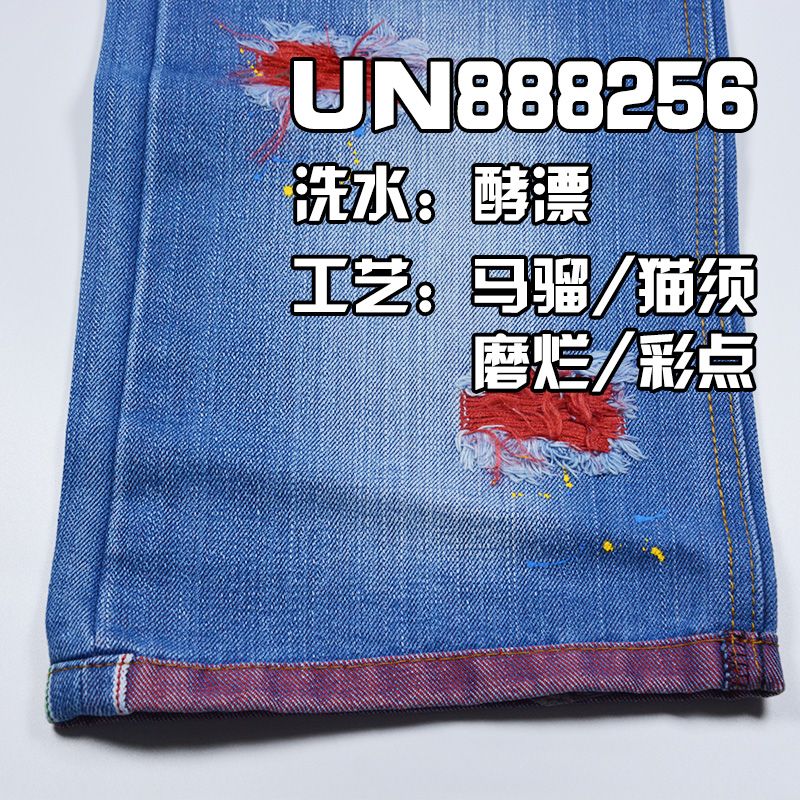 它是一款65%棉与35%涤纶,克重为11.9安士(oz),幅宽为31/32"的牛仔面料,主要工艺是“四片右斜+红边牛仔”,货号为UN888256;