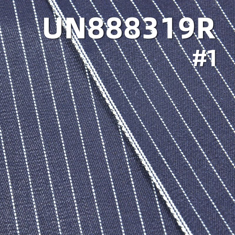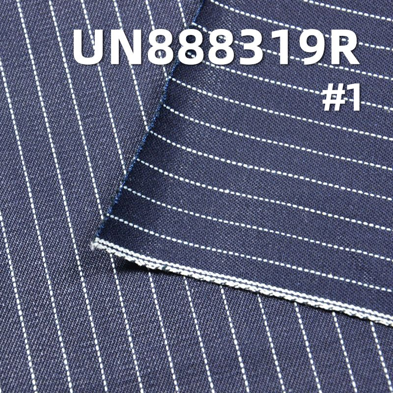它是一款100%全棉,克重为12安士(oz),幅宽为32/33"的牛仔面料,主要工艺是“三片右斜+条子色边牛仔”,货号为UN888319R;