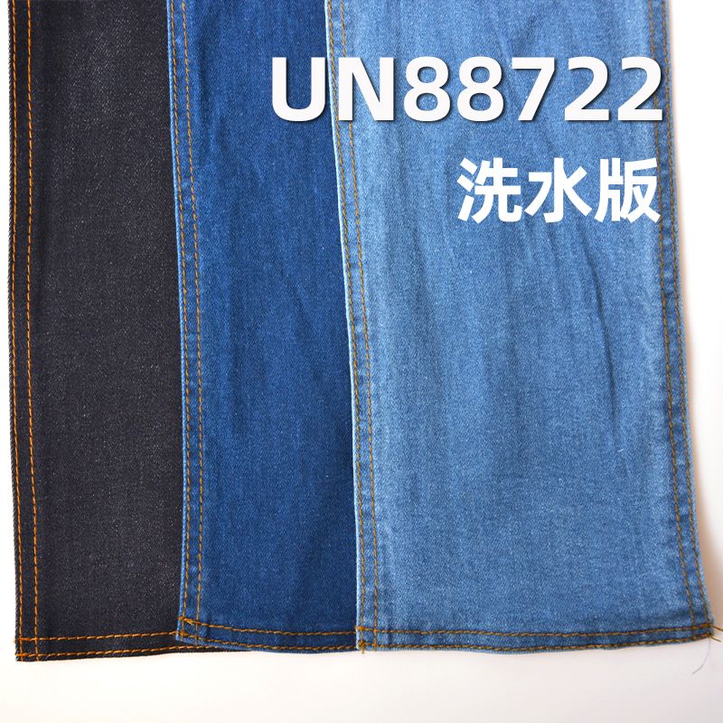 它是一款98%棉与2%氨纶,克重为10安士(oz),幅宽为57/58"的牛仔面料,主要工艺是“四片右斜+弹力牛仔”,货号为UN88722;