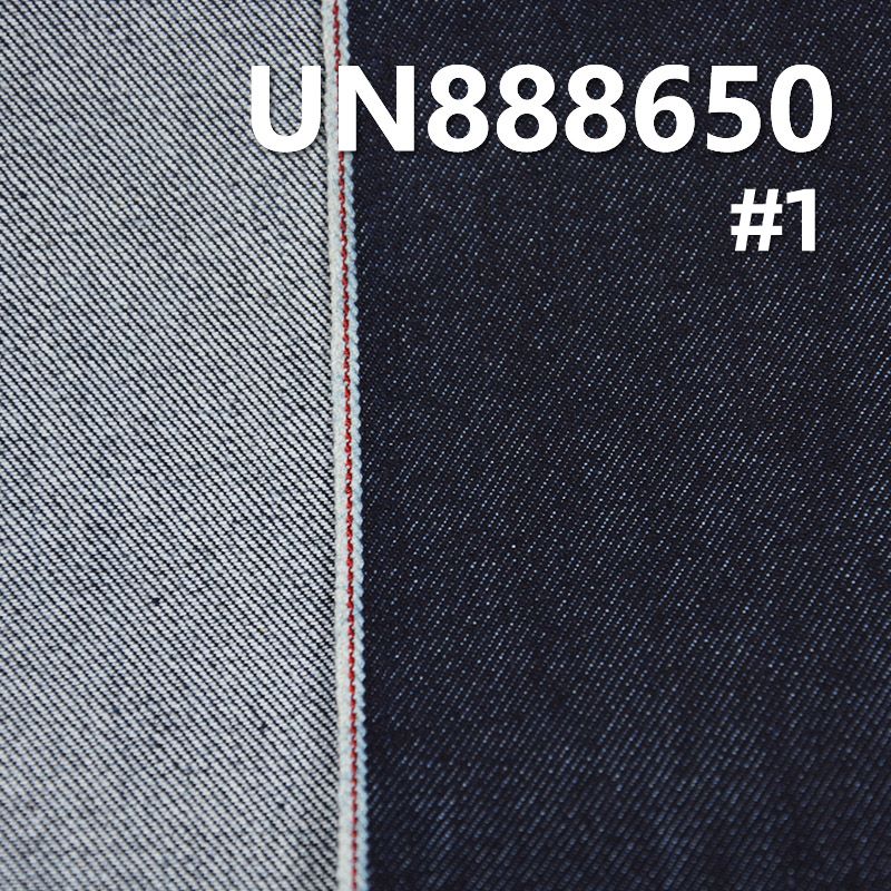 它是一款100%全棉,克重为14安士(oz),幅宽为30/31"的梭织面料,主要工艺是“四片右斜+红边牛仔”,货号为UN888650;