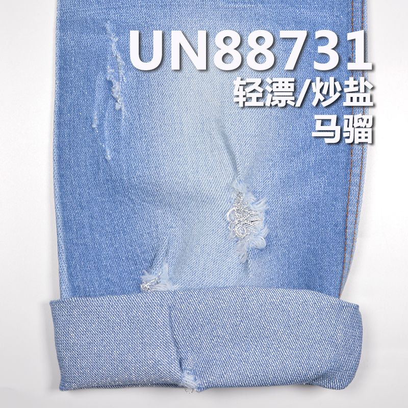 它是一款82%棉、17%银线与1%氨纶混纺,克重为11安士(oz),幅宽为57/58"的牛仔面料,主要工艺是“四片右斜+特深兰染色+银线混纺”,货号为UN88731;