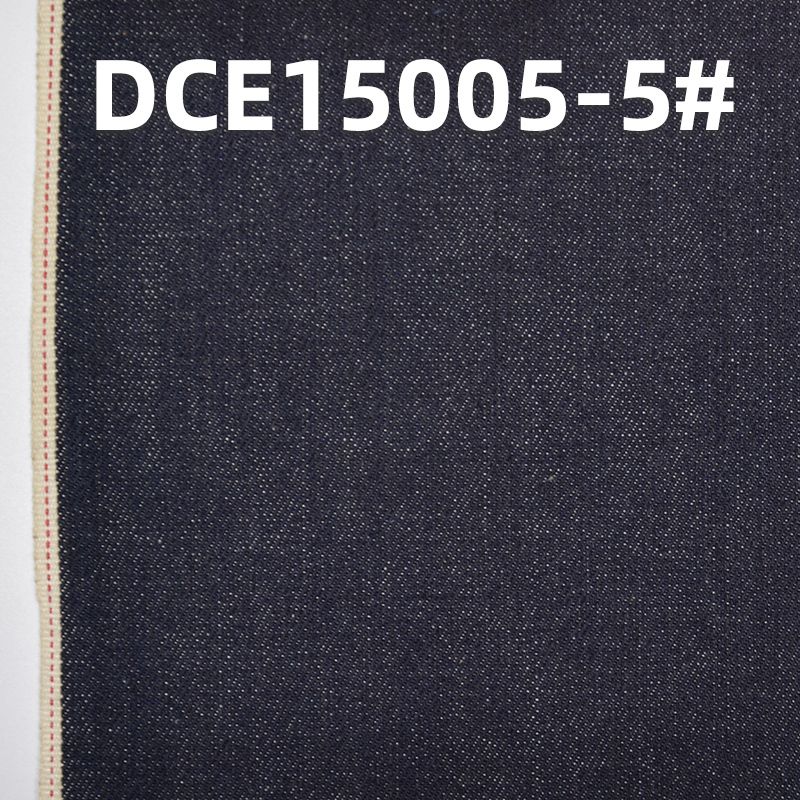 它是一款99%棉 1%氨纶,重量为13安士(oz)、幅宽为33/35" 的牛仔布料,主要工艺是“棉弹力+红边牛仔布”,货号为 DCE15005-5#;