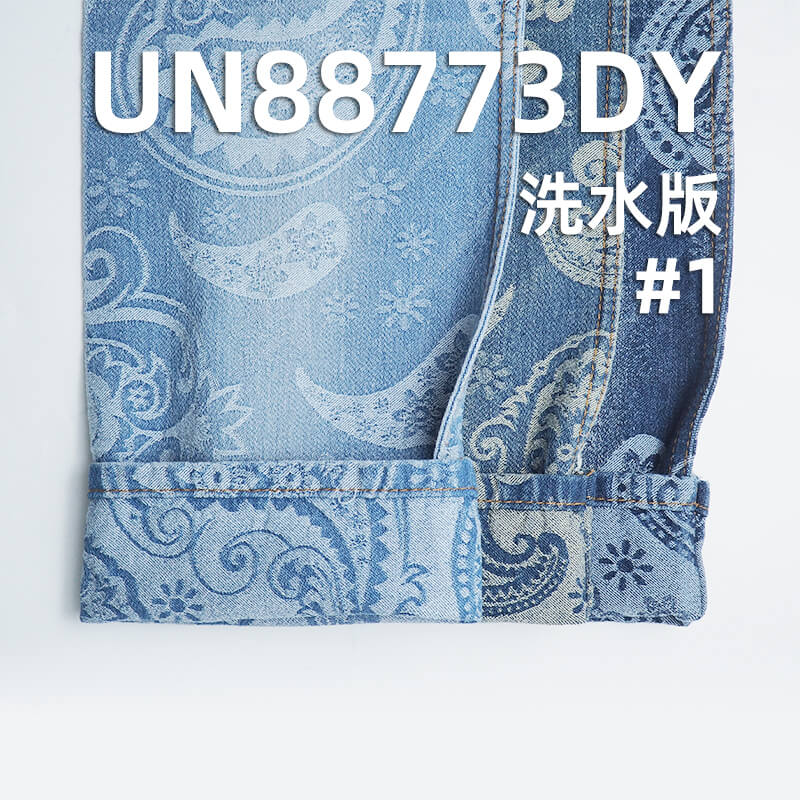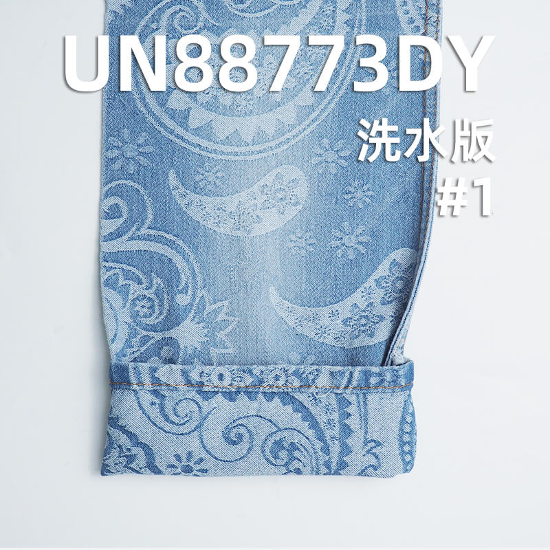它是一款58.4%棉28.6%粘胶13%涤纶,重量为10.6安(oz)、幅宽为 69/70" 的牛仔布料,主要工艺是“色丁+大提花牛仔”,货号为 UN88773DY;