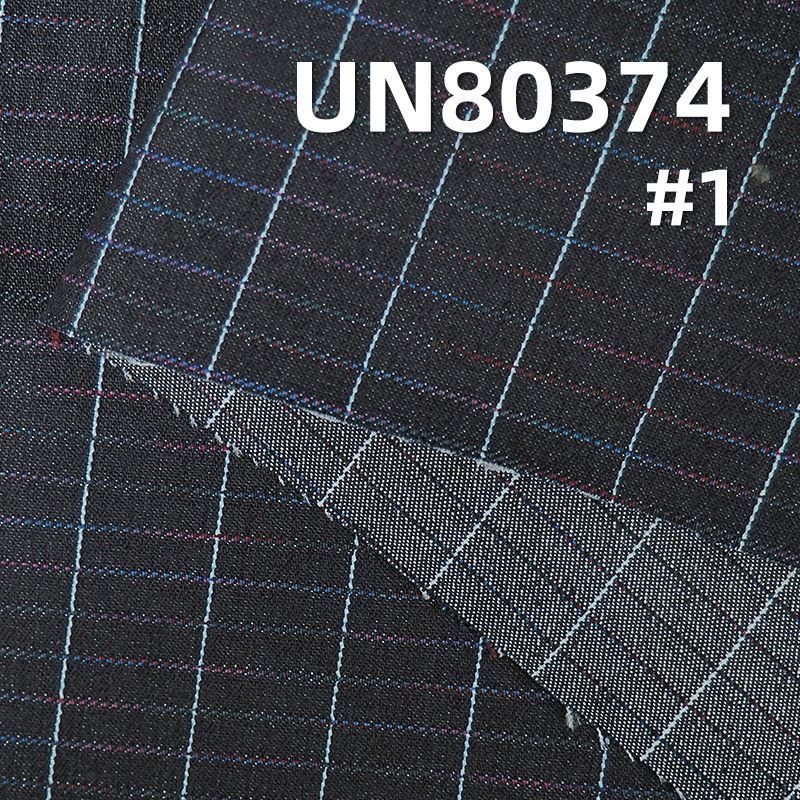 它是一款81%棉18%涤纶1%氨纶、重量为9.43安士(oz)、幅宽为 59" 的牛仔布料,主要工艺是“格仔+七彩斜纹牛仔”,货号为 UN80374;
