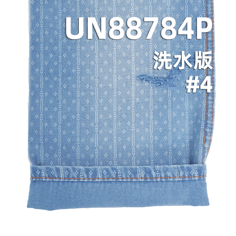 它是一款100%棉,重量为8.7安士(oz)、幅宽为 58/59"的牛仔布料,主要工艺是“蓝面蓝底+拔印印花”,货号为 UN88784P;