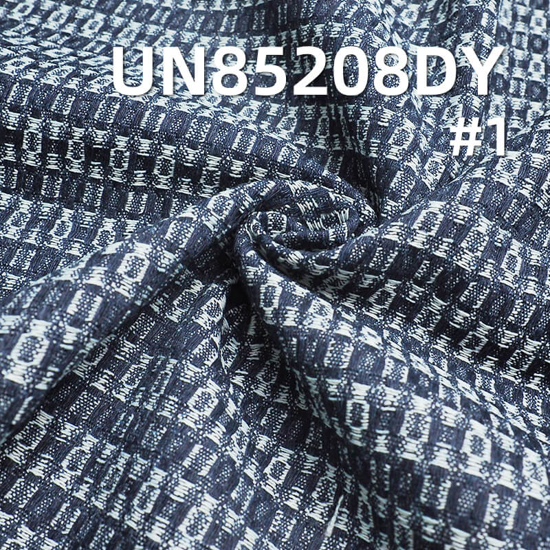 它是一款80%棉20%涤纶,重量为10.4安(oz)、幅宽为 70/71" 的牛仔布料,主要工艺是“小香风+大提花”,货号为 UN85208DY;