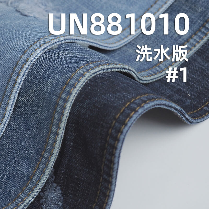 它是一款100%棉,重量为14.3安(oz)、幅宽为 66" 的秋冬款牛仔布料,主要工艺是“竹节棉+四片右斜”,货号为 UN881010;