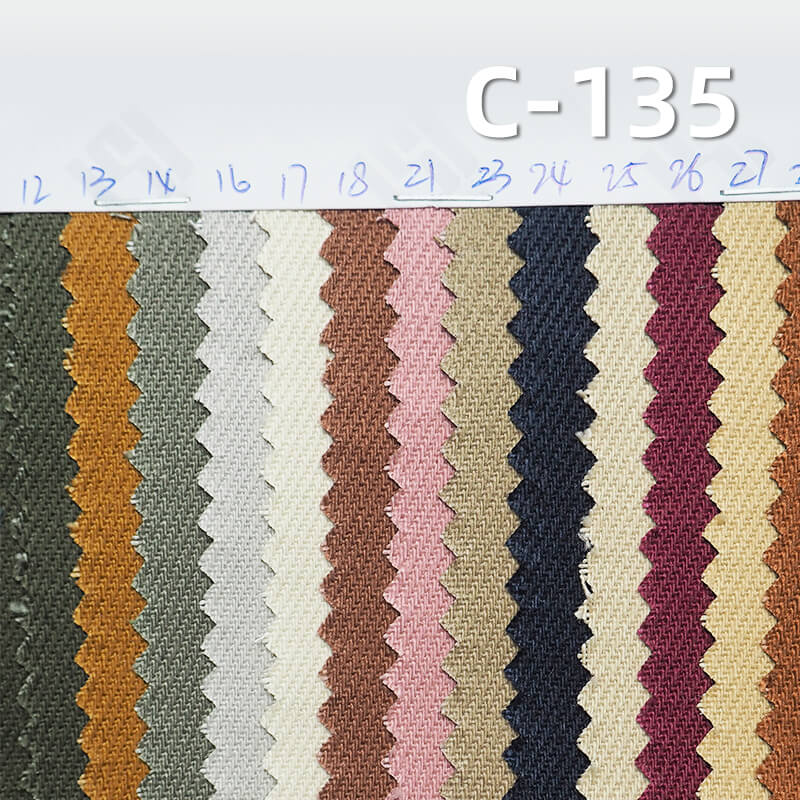 它是一款100%棉,重量为320g/m2,幅宽为 58/59" 的染色布料,主要工艺是“秋冬粗斜+全棉竹节纱卡”,货号为 C-135;