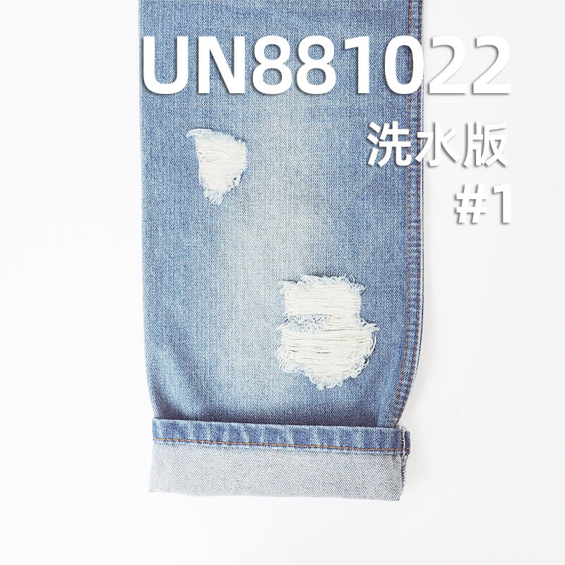 它是一款97%棉 3%粘胶,重量为 11.4安(oz)、幅宽为 62/63" 的牛仔布料,主要工艺是“四片右斜+仿竹节牛仔”,货号为 UN881022;