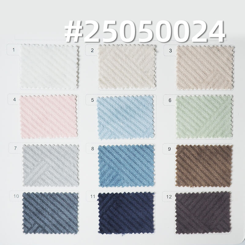 它是一款100%涤纶,重量为200g/m2,幅宽为 58/59" 的染色布料,主要工艺是“3D压花+经编绒布”,货号为 #25050024;