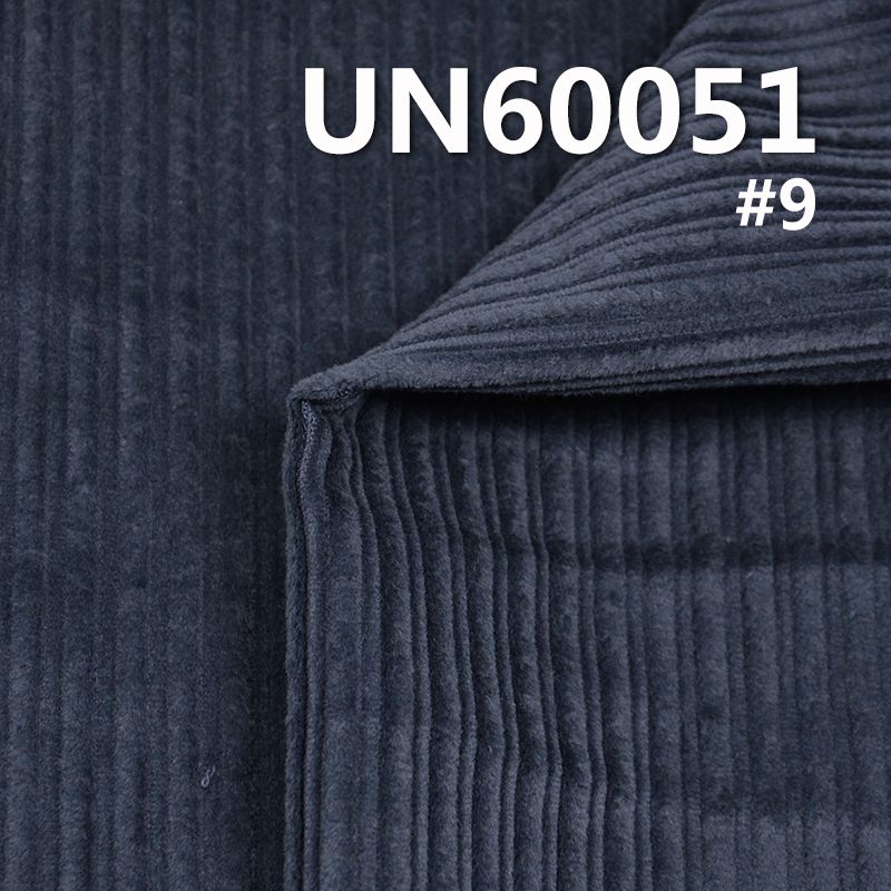 它是一款100%棉,重量为306g/m2、幅宽为 43/44" 的灯芯绒布料,主要工艺是“8坑子母坑+全棉灯芯绒”,货号为 UN60051;