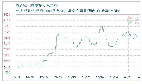 08月08日荣盛石化关于涤纶POY的报价为7700元/吨。涤纶POY的规格:分类:熔体纺;粗细:150D;孔数:48F;等级:优等品;颜色:白;色泽:半消光。该报价有效期为3天。报价提供方:荣盛石化股份有限公司。