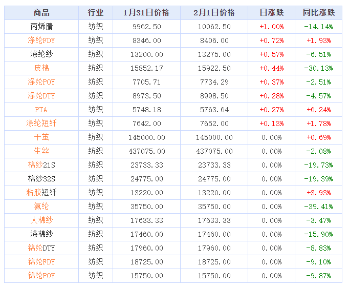 据生意社价格监测,2023年2月1日大宗商品价格涨跌榜中纺织版块环比上升的商品共8种,涨幅前3的商品分别为丙烯腈(1.00%)、涤纶FDY(0.72%)、涤纶纱(0.57%)。环比下降的商品共0种。本日均涨跌幅为0.2%。