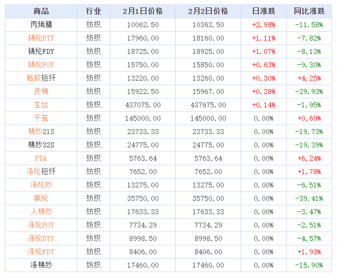 据生意社价格监测,2023年2月2日大宗商品价格涨跌榜中纺织版块环比上升的商品共7种,涨幅前3的商品分别为丙烯腈(2.98%)、锦纶DTY(1.11%)、锦纶FDY(1.07%)。环比下降的商品共0种。本日均涨跌幅为0.34%。
