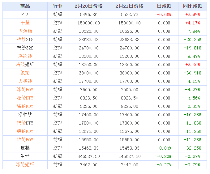 据生意社价格监测,2023年2月21日大宗商品价格涨跌榜中纺织版块环比上升的商品共1种,上涨的为PTA(0.66%)。环比下降的商品共3种,跌幅前3的商品分别为涤纶短纤(-0.27%),生丝(-0.20%),皮棉(-0.06%)。本日均涨跌幅为0.01%。