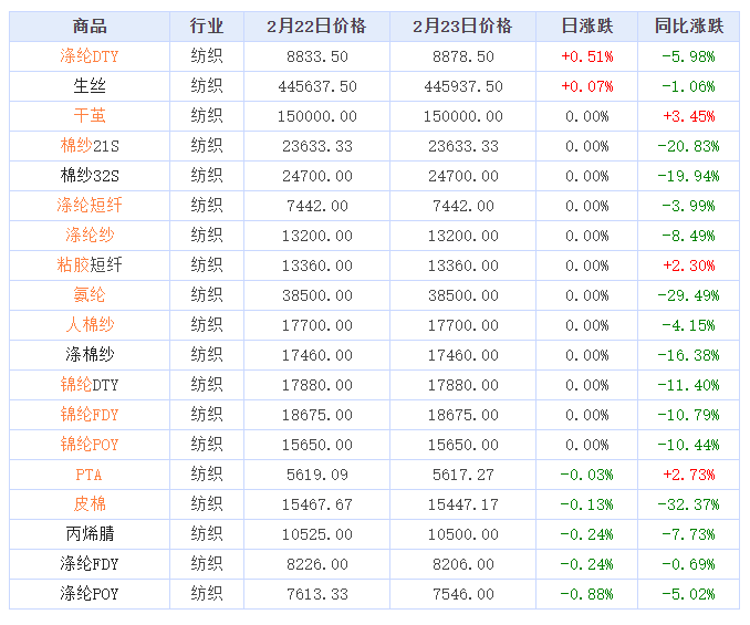 据生意社价格监测,2023年2月23日大宗商品价格涨跌榜中纺织版块环比上升的商品共2种,涨幅前2的商品分别为涤纶DTY(0.51%)、生丝(0.07%)。环比下降的商品共5种,跌幅前3的商品分别为涤纶POY(-0.88%),涤纶FDY(-0.24%),丙烯腈(-0.24%)。本日均涨跌幅为-0.05%。
