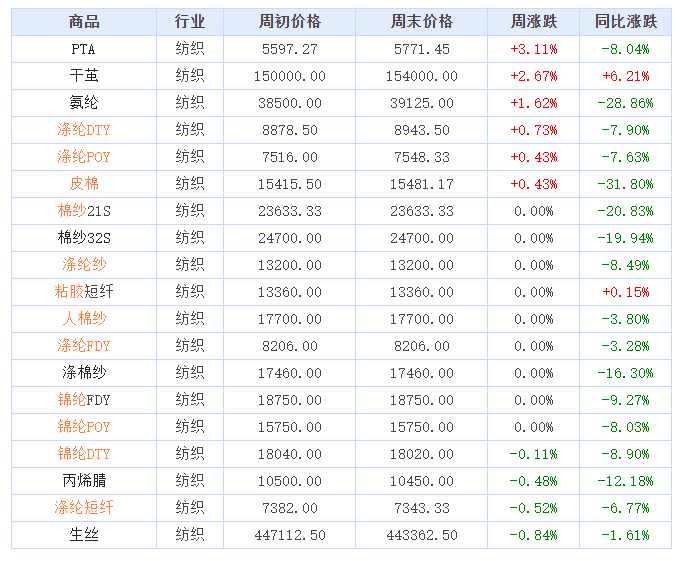 据生意社价格监测,2023年第09周(2.27-3.3)大宗商品价格涨跌榜中纺织版块环比上升的商品共6种,涨幅前3的商品分别为PTA(3.11%)、干茧(2.67%)、氨纶(1.62%)。环比下降的商品共4种,跌幅前3的商品分别为生丝(-0.84%),涤纶短纤(-0.52%),丙烯腈(-0.48%)。本周均涨跌幅为0.37%。