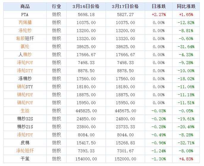 据生意社价格监测,2023年3月17日大宗商品价格涨跌榜中纺织版块环比上升的商品共1种,上涨的为PTA(2.27%)。环比下降的商品共7种,跌幅前3的商品分别为干茧(-1.30%),涤纶短纤(-1.24%),皮棉(-0.96%)。本日均涨跌幅为-0.12%。