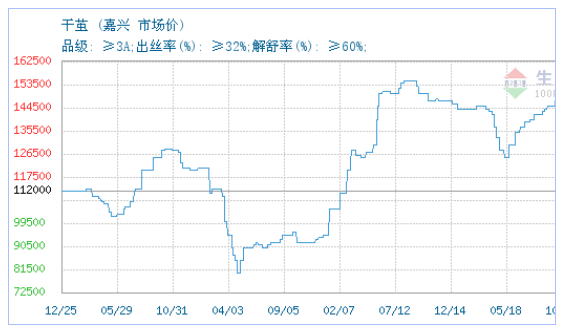 03月21日中国茧丝绸交易市场(嘉兴)关于干茧的报价为148500元/吨。干茧的规格:品级: ≥3A;出丝率(%): ≥32%;解舒率(%): ≥60%;。该报价有效期为3天。报价提供方:中国茧丝绸交易市场(嘉兴)。