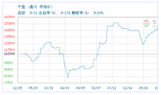 03月27日中国茧丝绸交易市场(嘉兴)关于干茧的报价为143500元/吨。干茧的规格:品级: ≥3A;出丝率(%): ≥32%;解舒率(%): ≥60%;。该报价有效期为3天。报价提供方:中国茧丝绸交易市场(嘉兴)。