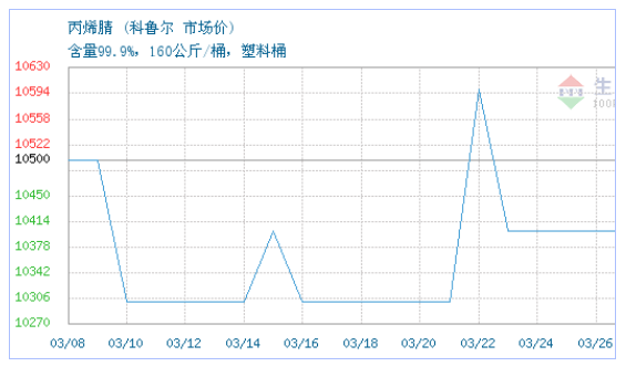 03月29日科鲁尔关于丙烯腈的报价为10400元/吨。丙烯腈的规格:含量99.9%,160公斤/桶,塑料桶。该报价有效期为1天。报价提供方:扬州利宏日化科技有限公司。